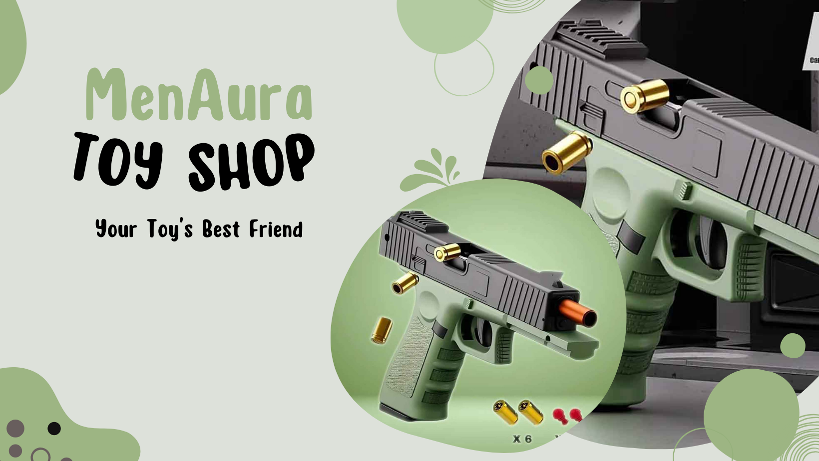 Gun ka close-up angle rakhen, jisme barrel aur grip clearly dikhai de. Text side corner par ho, white + red combination mein. Background light green ya blue ho jo โsafeโ feel de.